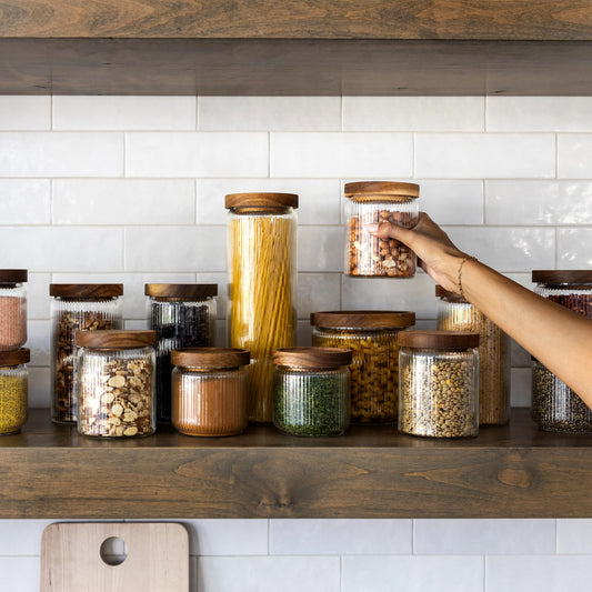 350ml-12 fl.oz Ribbed Glass Storage Jars with Airtight Wooden Lids - Set of 6