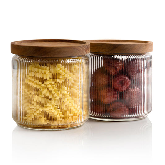 2.1L Ribbed Glass Storage Jars with Airtight Wooden Lids - Set of 2