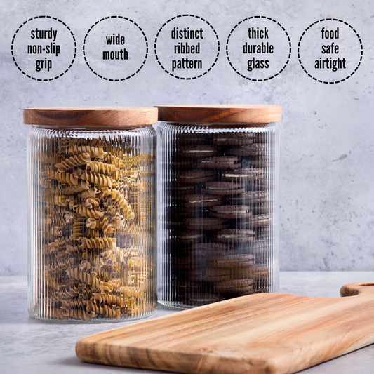 1800ml Ribbed Glass Storage Jars with Airtight Wooden Lids - Set of 2